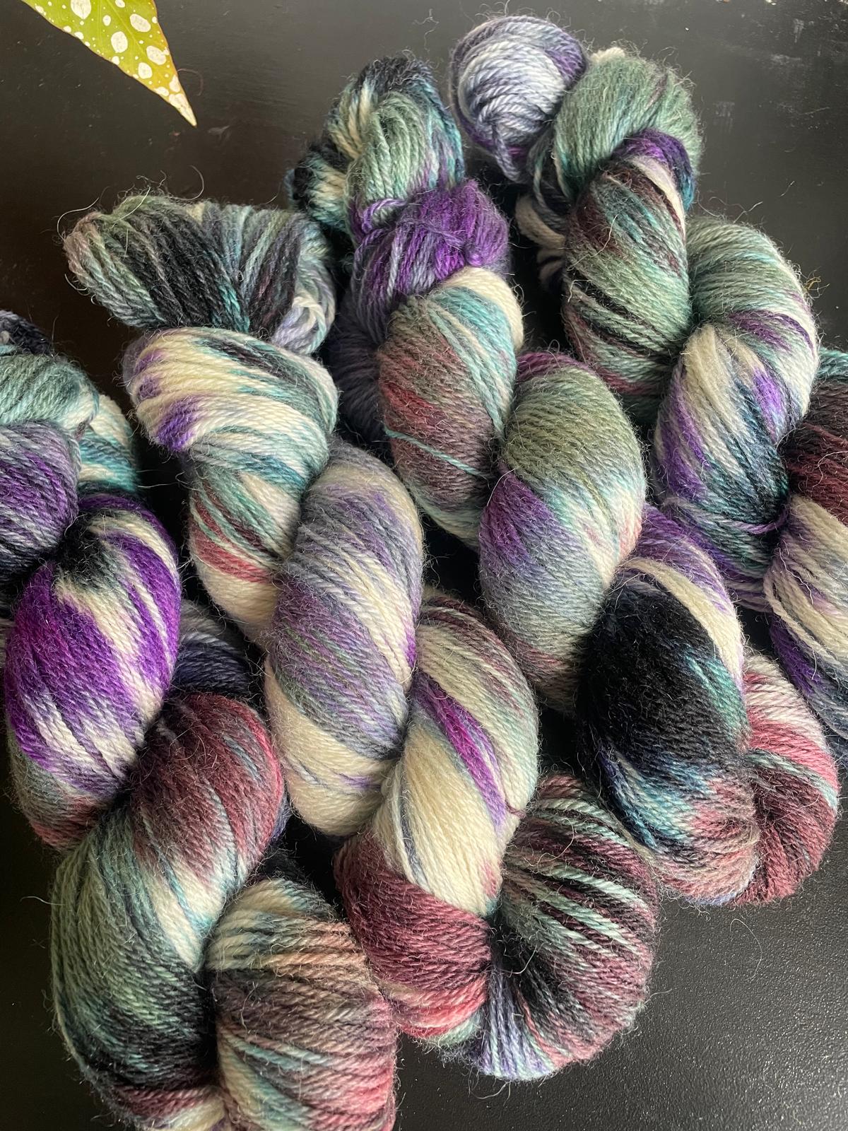 Inspired by the spectacular Scottish highlands this beautiful hand dyed yarn includes splashes of purple, green, brown and grey.
