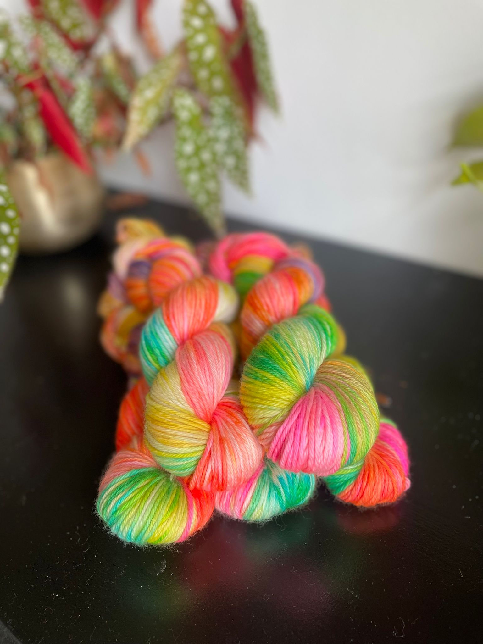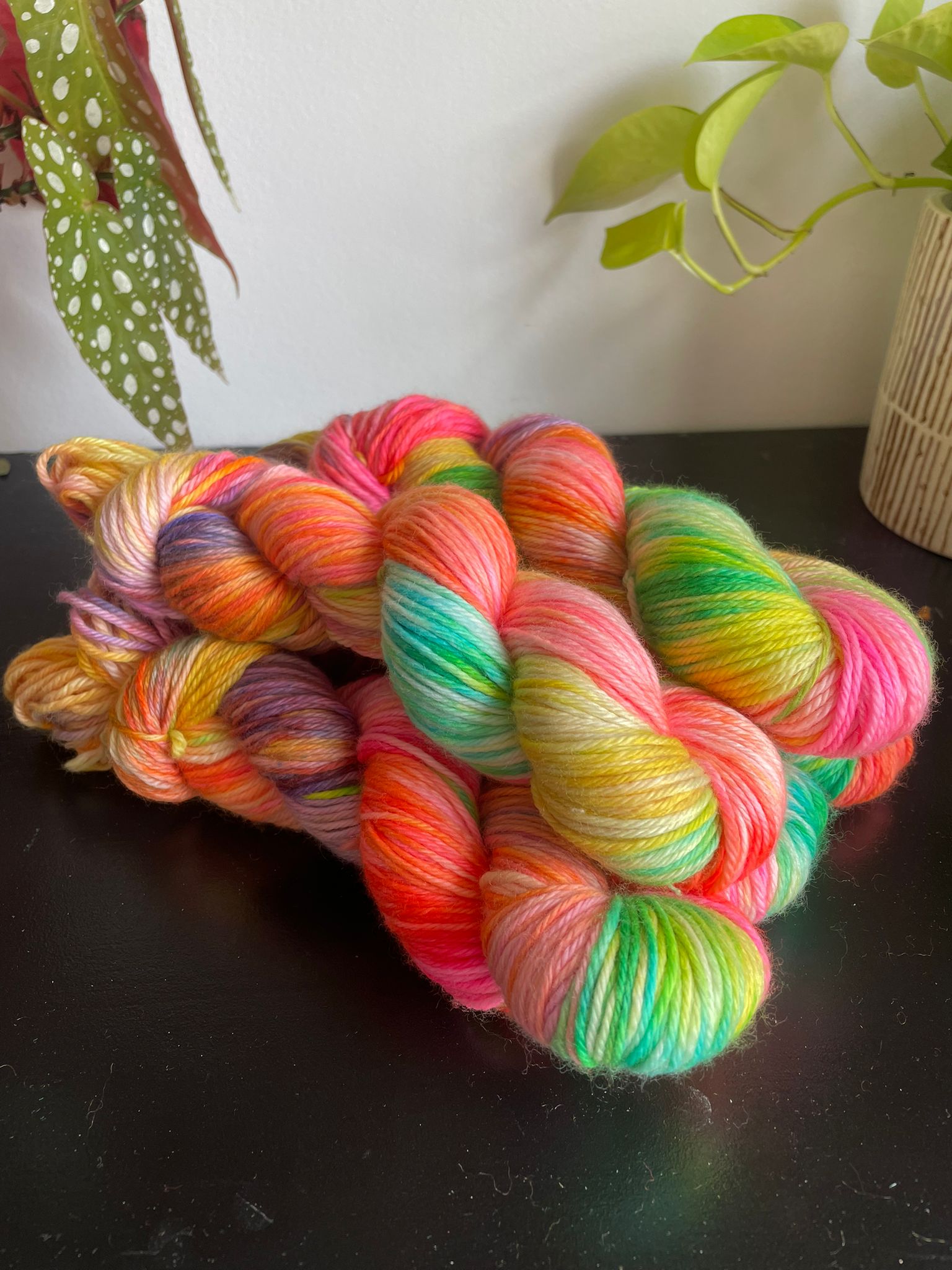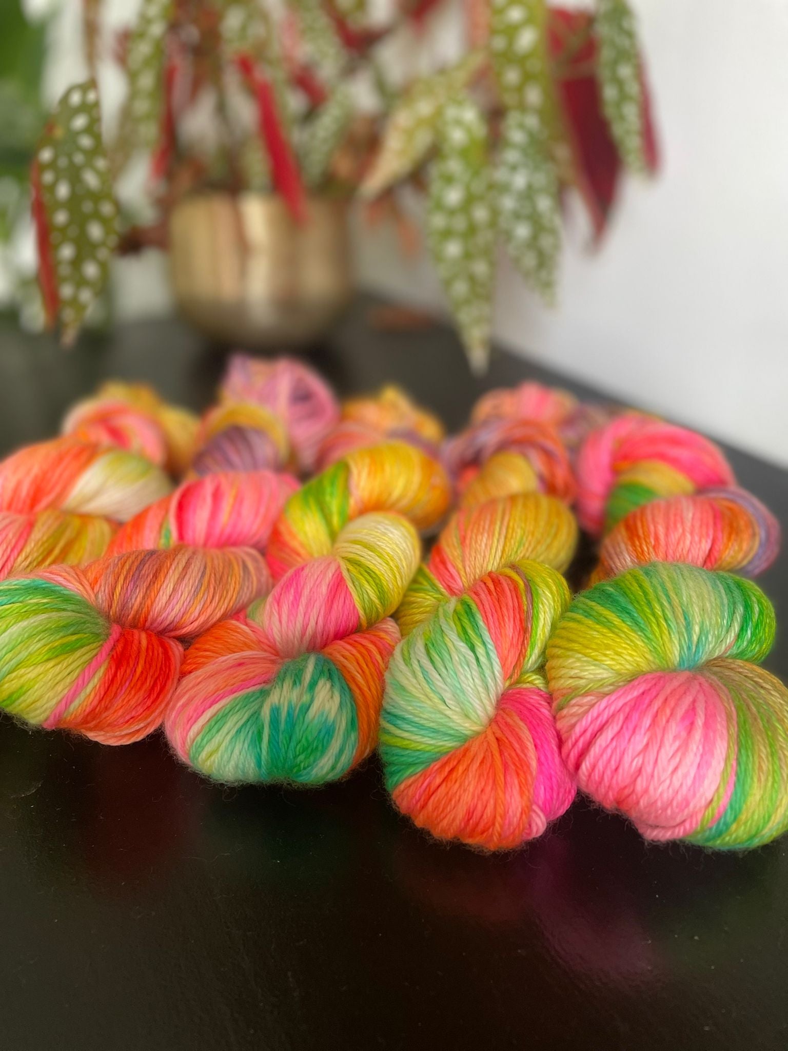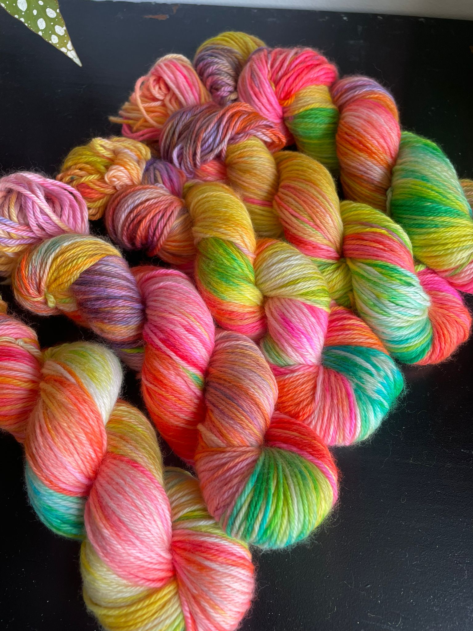 Inspired by the refreshing ice lollies you enjoy in the sunshine this beautiful hand dyed yarn includes shades of green, pink, purple, yellow and orange. This is a wonderfully soft yarn.
