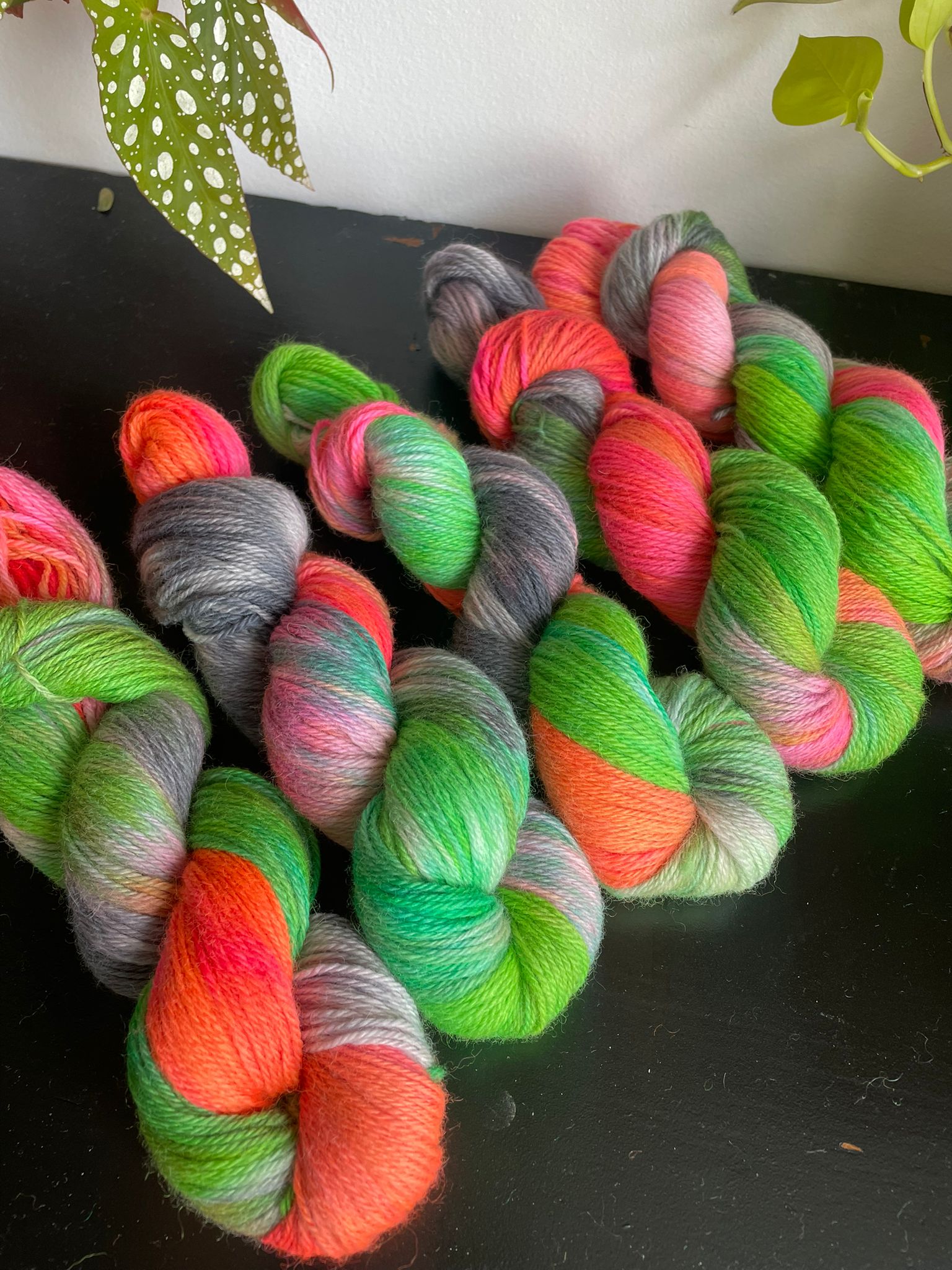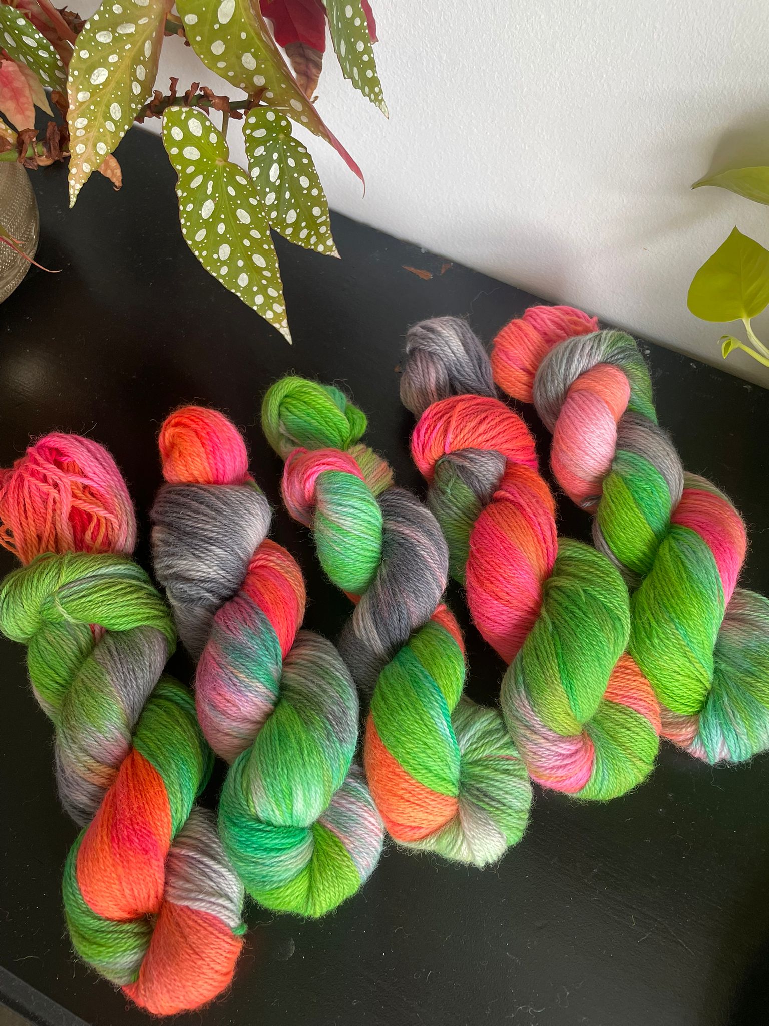 Inspired by an enchanting mermaid, this beautiful hand dyed yarn includes shades of coral, pink, green and grey.