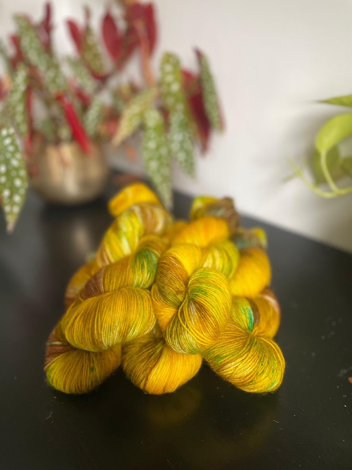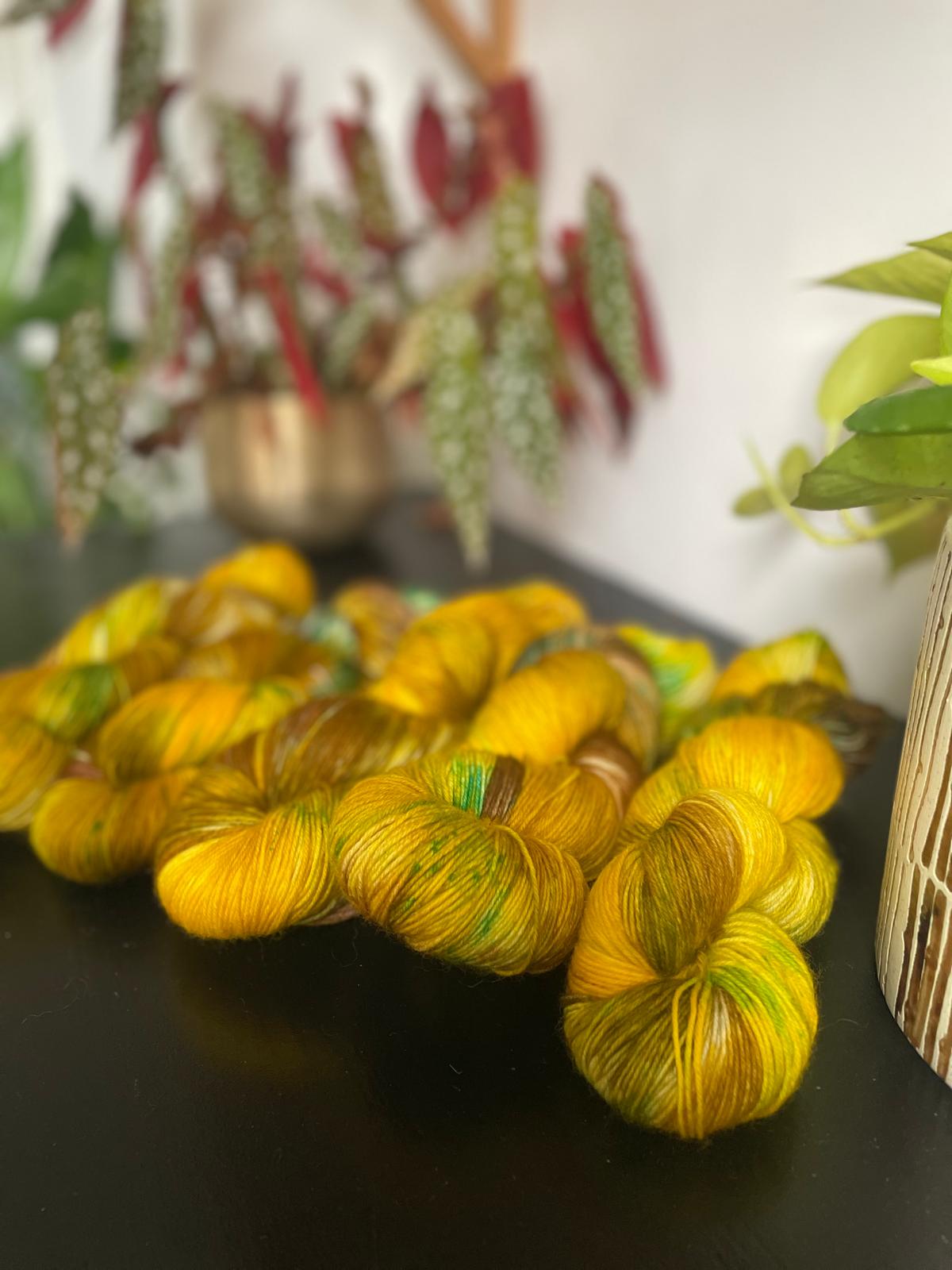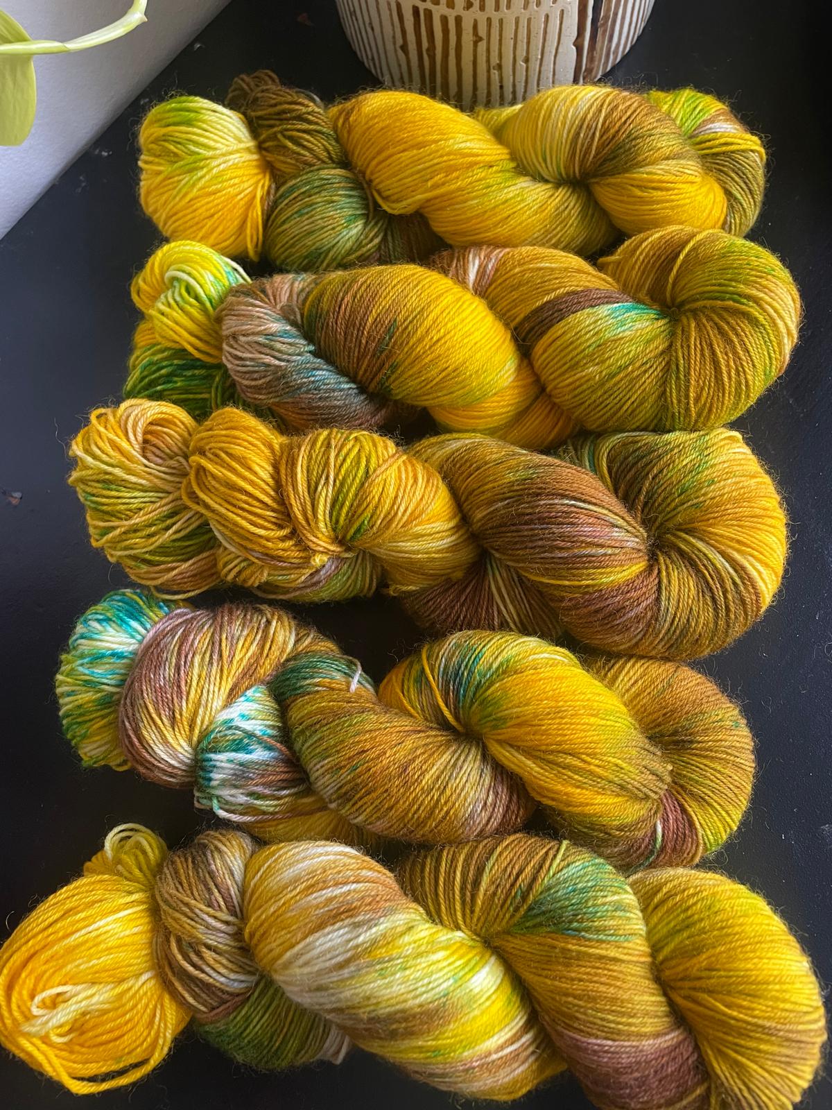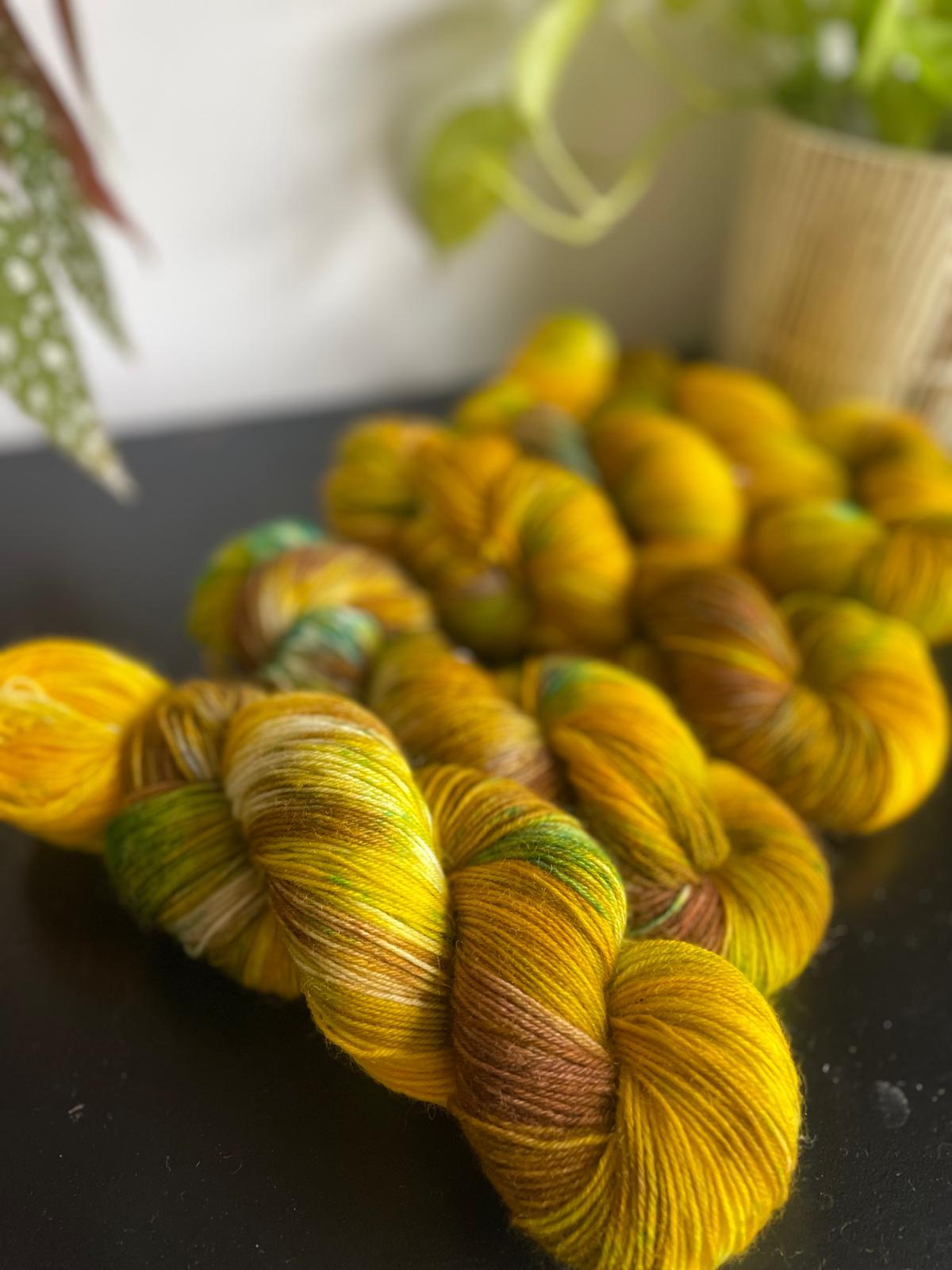 Inspired by those Autumn walks where the leaves have hit the ground this beautiful hand dyed yarn includes shades of brown, yellow, mustard and green