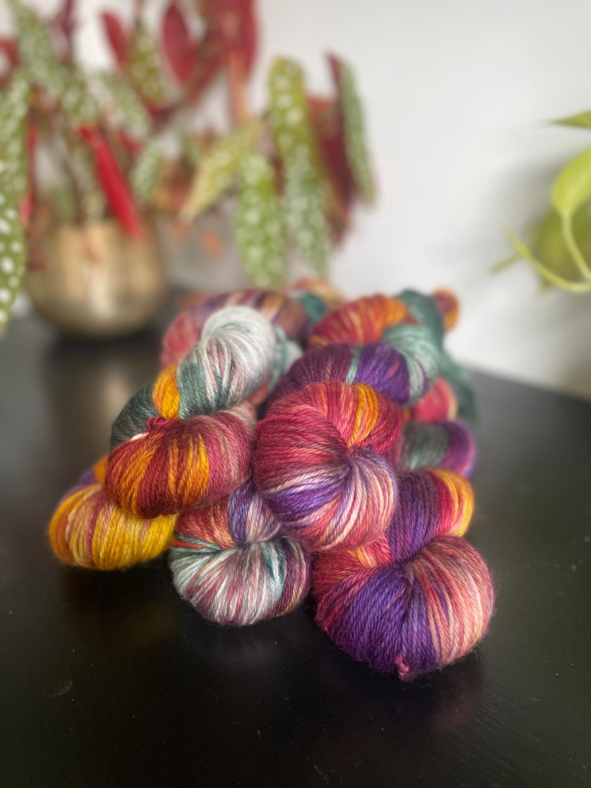 Inspired by the colourful Carolina Duck this beautiful hand dyed yarn includes shades of green, brown, purple, yellow and maroon. This is a wonderfully soft yarn.